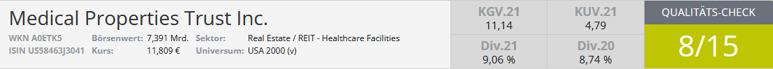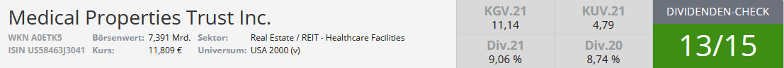 Weitere 20 Anteile an dem Unternehmen "Medical Properties Trust Inc." habe ich zu einem Wert von 228,32 Euro erworben. Durch diesen Kauf ist meine Investmentquote erstmal für MPW erreicht. Der Gesamtanteil liegt jetzt bei 85 Stück.