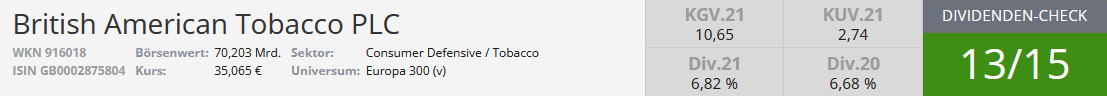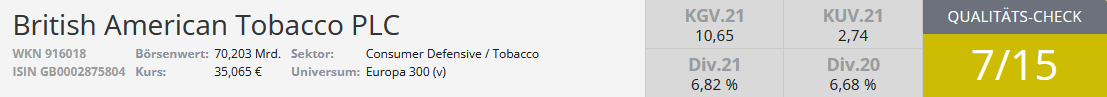 Auf der Gegenseite steht Johnson & Johnson mit einem Minus von 9,92 % am Ende der Übersicht. Gefolgt von der PepsiCo Inc. mit 8,15 % im Minus und British American Tobacco Plc. mit einem Minus von 6,64 %.